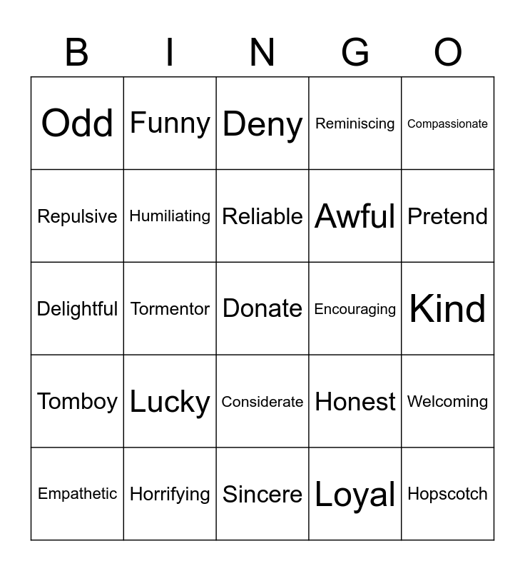 This bingo card has a free space and 24 words: Lucky, Horrifying, Reliable, Empathetic, Compassionate, Odd, Repulsive, Funny, Encouraging, Considerate, Awful, Delightful, Honest, Welcoming, Humiliating, Loyal, Kind, Deny, Pretend, Tormentor, Hopscotch, Tomboy, Reminiscing and Sincere.