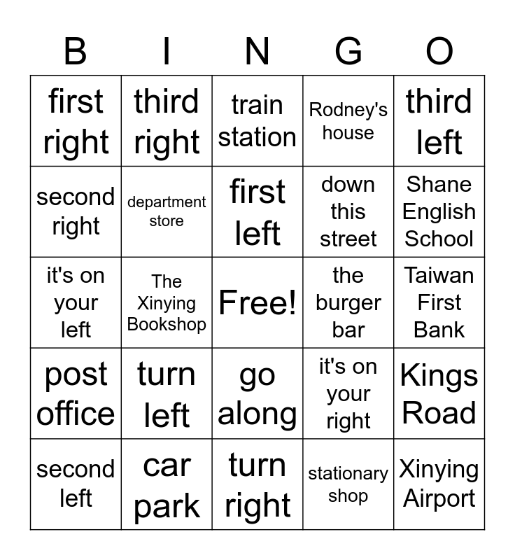 This bingo card has a free space and 25 words: turn left, turn right, first left, second left, third left, first right, second right, third right, the burger bar, go along, down this street, it's on your left, it's on your right, Kings Road, department store, monument, Taiwan First Bank, train station, Shane English School, The Xinying Bookshop, Xinying Airport, car park, post office, Rodney's house and stationary shop.