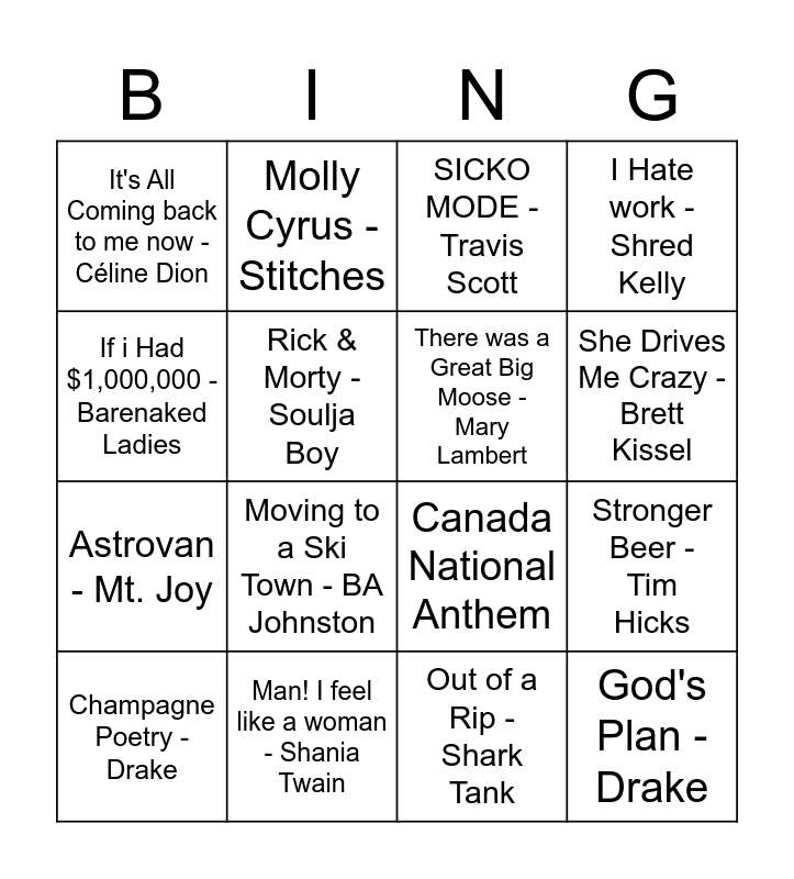 This bingo card has 16 words: Man! I feel like a woman - Shania Twain, Stronger Beer - Tim Hicks, SICKO MODE - Travis Scott, It's All Coming back to me now - Céline Dion, Astrovan - Mt. Joy, Molly Cyrus - Stitches, Canada National Anthem, Out of a Rip - Shark Tank, If i Had $1,000,000 - Barenaked Ladies, Rick & Morty - Soulja Boy, Champagne Poetry - Drake, I Hate work - Shred Kelly, Moving to a Ski Town - BA Johnston, She Drives Me Crazy - Brett Kissel, There was a Great Big Moose - Mary Lambert and God's Plan - Drake.