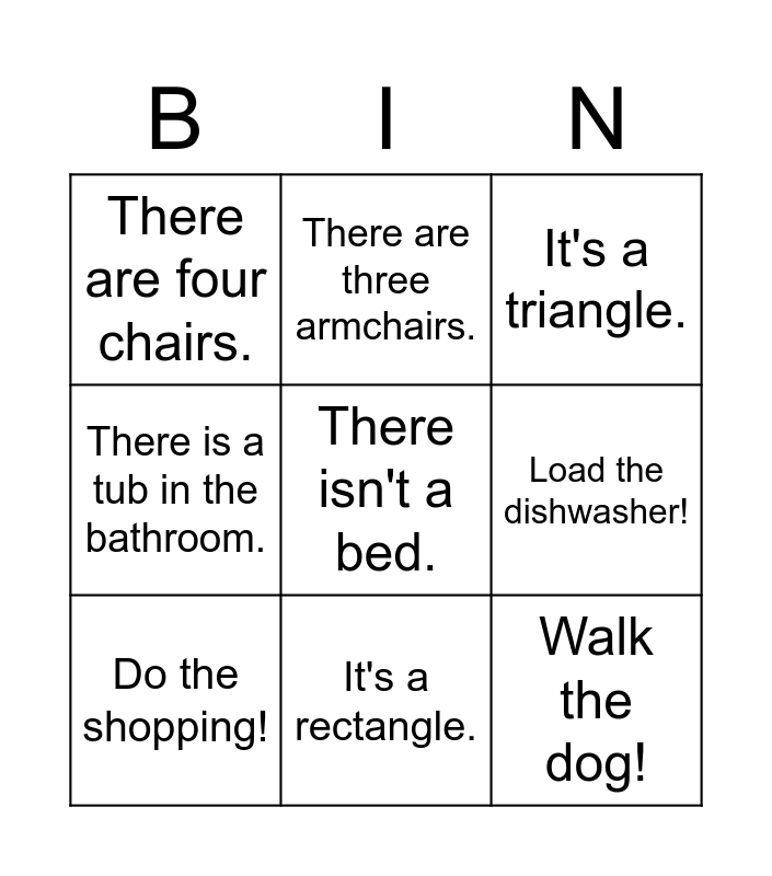This bingo card has 15 words: It's a circle., There is a sofa in the living-room., It's a triangle., There are four chairs., It's a rectangle., There isn't a bed., There are seven books on the shelf., The cat is in the box., Load the dishwasher!, Walk the dog!, The laptop is on the table., There is a tub in the bathroom., Do the shopping!, There are three armchairs. and Throw the rubbish out..