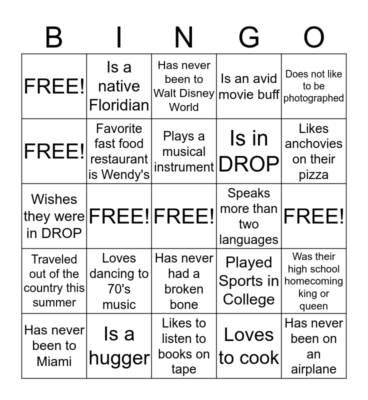 This bingo card has a free space and 24 words: Loves dancing to 70's music, Is a hugger, Plays a musical instrument, Has never been to Miami, Does not like to be photographed, FREE!, FREE!, Is a native Floridian, Speaks more than two languages, Has never had a broken bone, Is in DROP, Wishes they were in DROP, Played Sports in College, Was their high school homecoming king or queen, Favorite fast food restaurant is Wendy's, Loves to cook, FREE!, Has never been to Walt Disney World, Likes anchovies on their pizza, FREE!, Has never been on an airplane, Traveled out of the country this summer, Is an avid movie buff and Likes to listen to books on tape.