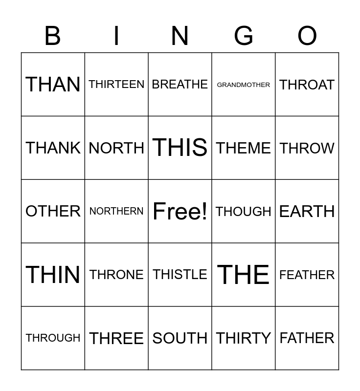 This bingo card has a free space and 49 words: THIN, FATHER, BROTHER, SOUTH, THRONE, THORN, THIRTEEN, THRILLER, THANK, WORTH, NORTH, GRANDMOTHER, FEATHER, THE, THICK, THAT, THIS, THOUGH, THERAPY, THROAT, NORTHERN, THIRTY, THAN, THEME, THUMB, THROW, THROUGH, THOSE, THISTLE, THIN, THREAT, WEATHER, MOTHER, THERE, THREE, BIRTH, TOOTH, AUTHOR, EARTH, HEALTHY, NOTHING, BATH, MOUTH, TOGETHER, OTHER, BREATHE, CLOTHES, CLOTH and THESE.