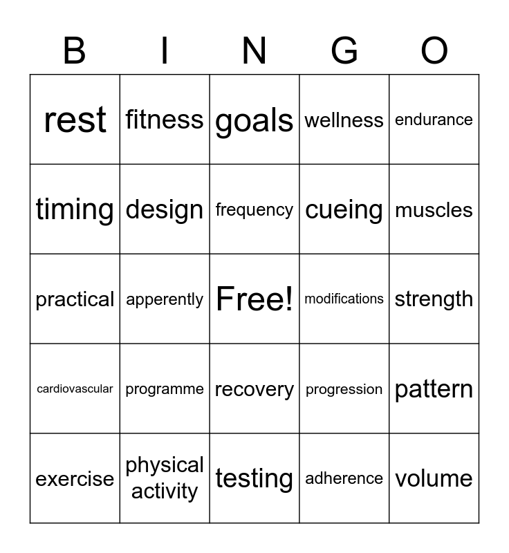 This bingo card has a free space and 33 words: activity, adult, apperently, assessment, cardiovascular, design, endurance, exercise, fitness, flexibility, frequency, goals, healthy, intensity, modifications, muscles, physical activity, practical, programme, progression, recovery, rehab, rest, strength, testing, volume, wellness, cueing, timing, pattern, movement, adherence and enjoyment.