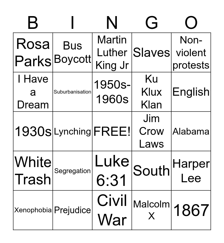 This bingo card has a free space and 24 words: Segregation, Prejudice, 1950s-1960s, Xenophobia, Non-violent protests, Rosa Parks, I Have a Dream, Bus Boycott, Jim Crow Laws, Luke 6:31, Ku Klux Klan, 1930s, South, Harper Lee, Suburbanisation, Malcolm X, Alabama, Martin Luther King Jr, English, Lynching, 1867, White Trash, Slaves and Civil War.