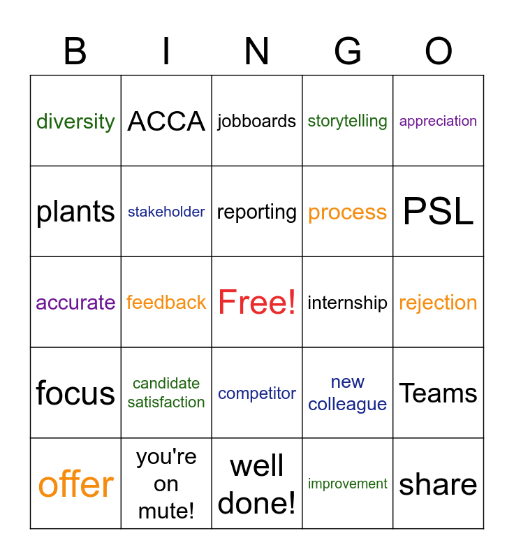 This bingo card has a free space and 24 words: candidate satisfaction, you're on mute!, reporting, offer, appreciation, diversity, plants, ACCA, internship, competitor, process, accurate, new colleague, Teams, stakeholder, improvement, rejection, jobboards, PSL, feedback, share, focus, storytelling and well done!.