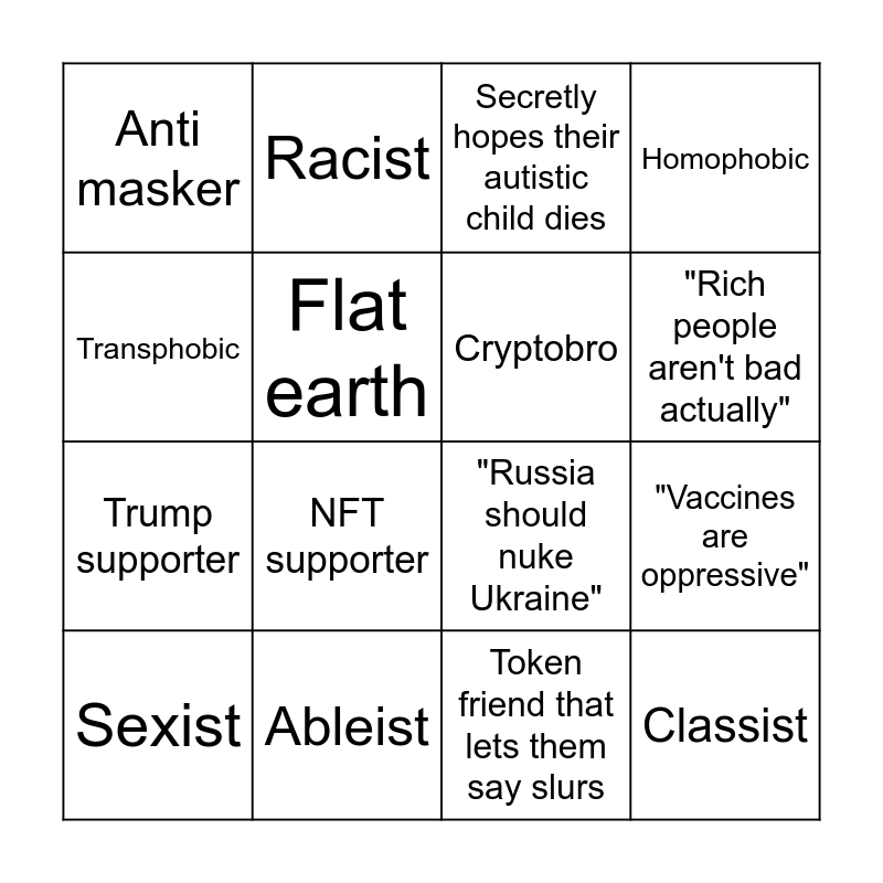 This bingo card has 16 words: Ableist, "Vaccines are oppressive", Secretly hopes their autistic child dies, Anti masker, Trump supporter, Racist, "Russia should nuke Ukraine", Token friend that lets them say slurs, Transphobic, Flat earth, Sexist, Homophobic, NFT supporter, "Rich people aren't bad actually", Cryptobro and Classist.