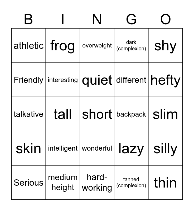 This bingo card has 25 words: intelligent, hard-working, quiet, Serious, shy, athletic, Friendly, frog, backpack, wonderful, different, talkative, lazy, silly, interesting, thin, slim, overweight, hefty, tall, short, medium height, skin, dark (complexion) and tanned (complexion).