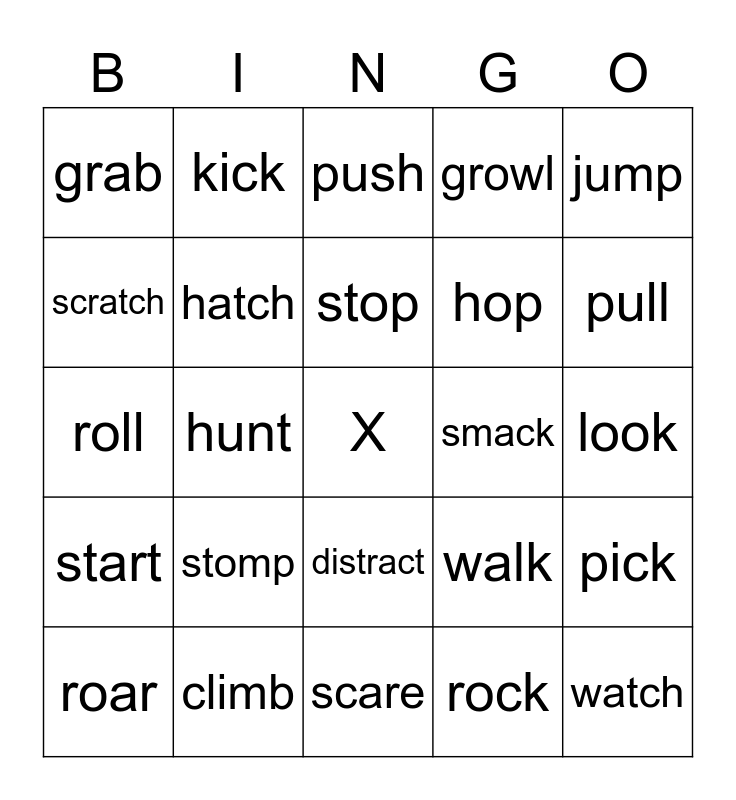 This bingo card has a free space and 24 words: stomp, climb, stop, roar, jump, grab, scratch, kick, smack, distract, hop, roll, walk, pick, hatch, rock, look, push, pull, hunt, watch, start, growl and scare.
