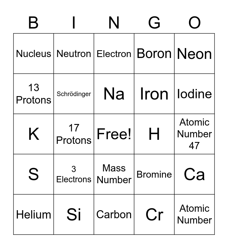 This bingo card has a free space and 24 words: 3 Electrons, Si, Na, Helium, Neon, Nucleus, 13 Protons, Neutron, H, Mass Number, Iron, K, Bromine, Ca, Schrödinger, Cr, Atomic Number 47, Electron, Iodine, 17 Protons, Atomic Number, S, Boron and Carbon.