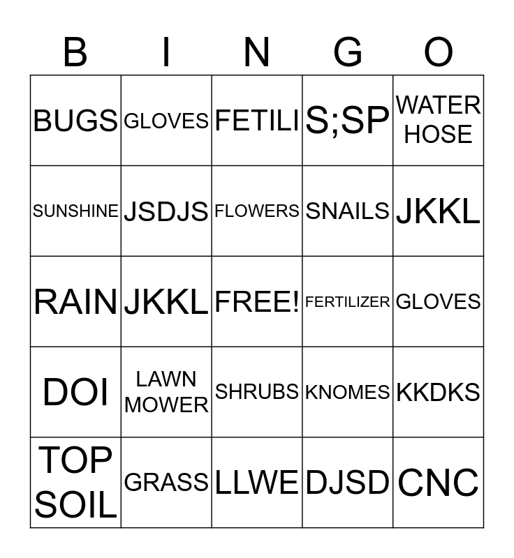 This bingo card has a free space and 24 words: LAWN MOWER, GRASS, FLOWERS, TOP SOIL, WATER HOSE, BUGS, SUNSHINE, GLOVES, FERTILIZER, SHRUBS, SNAILS, RAIN, KNOMES, KKDKS, JSDJS, DJSD, GLOVES, FETILI, JKKL, JKKL, CNC, DOI, S;SP and LLWE.