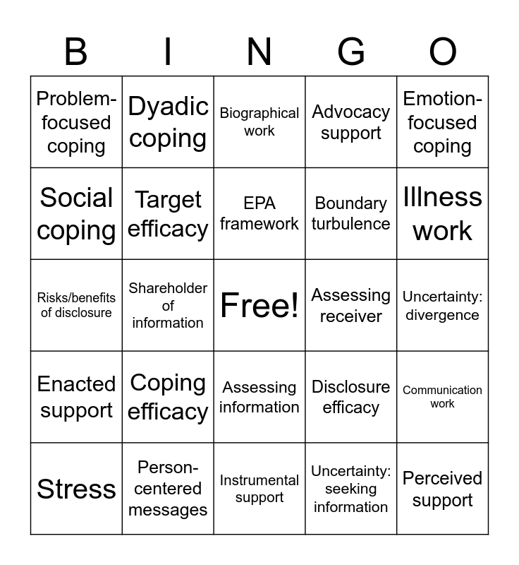 This bingo card has a free space and 24 words: Coping efficacy, Person-centered messages, EPA framework, Stress, Emotion-focused coping, Problem-focused coping, Social coping, Dyadic coping, Assessing receiver, Assessing information, Boundary turbulence, Risks/benefits of disclosure, Disclosure efficacy, Communication work, Target efficacy, Uncertainty: seeking information, Uncertainty: divergence, Biographical work, Illness work, Shareholder of information, Perceived support, Enacted support, Advocacy support and Instrumental support.