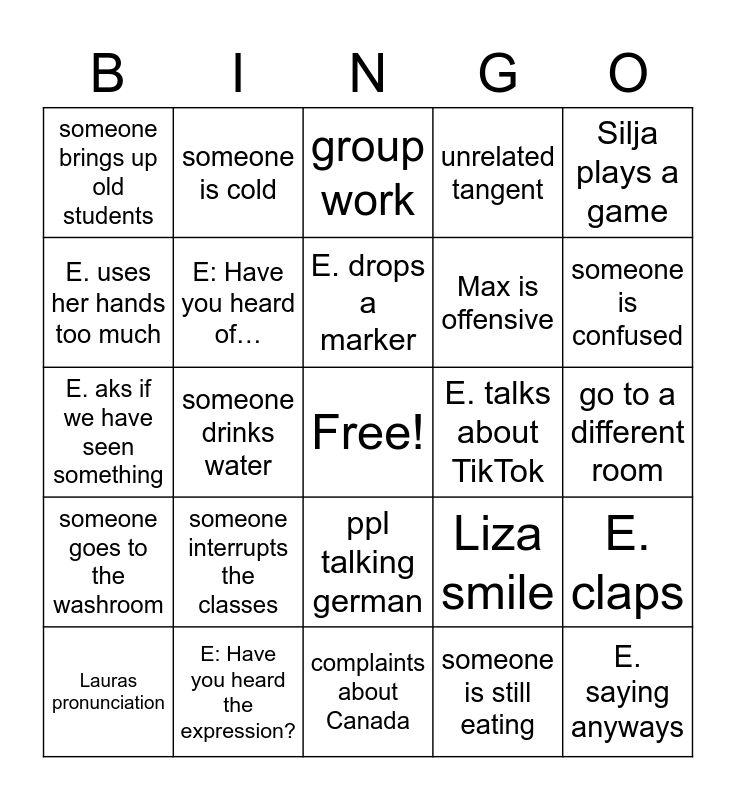 This bingo card has a free space and 24 words: someone interrupts the classes, E: Have you heard the expression?, E. drops a marker, Lauras pronunciation, Silja plays a game, someone brings up old students, E. uses her hands too much, someone is cold, E. talks about TikTok, ppl talking german, Max is offensive, E. aks if we have seen something, Liza smile, E. claps, E: Have you heard of…, someone is still eating, go to a different room, group work, someone is confused, someone drinks water, E. saying anyways, someone goes to the washroom, unrelated tangent and complaints about Canada.