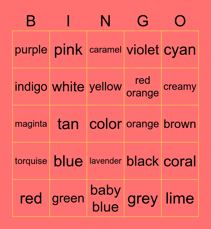 This bingo card has a free space and 24 words: blue, green, yellow, red, cyan, purple, indigo, pink, orange, lavender, red orange, maginta, black, coral, white, grey, brown, caramel, creamy, tan, lime, torquise, violet and baby blue.