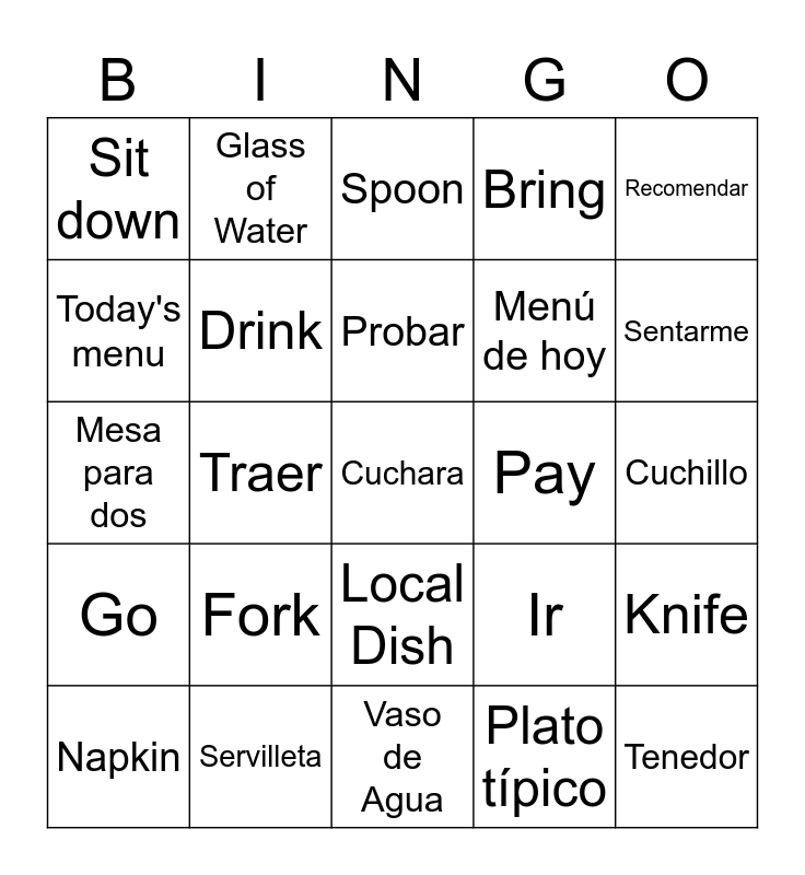 This bingo card has 36 words: Pedir, Order, Tomar / Beber, Drink, Ir, Go, Probar, Try, Recomendar, Recommend, Traer, Bring, Pagar, Pay, Sentarme, Sit down, Tenedor, Fork, Cuchara, Spoon, Cuchillo, Knife, Servilleta, Napkin, Vaso de Agua, Glass of Water, Mesa para dos, Table for two, Menú de hoy, Today's menu, Plato, Plate, Plato típico, Local Dish, Una Noche en la Ciudad and A Night on the Town.