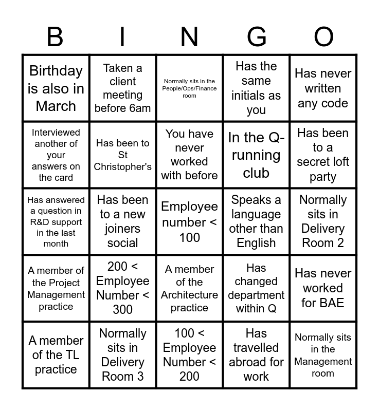 This bingo card has 47 words: Free!, Employee number < 100, Employee number > 400, 100 < Employee Number < 200, 200 < Employee Number < 300, 300 < Employee Number < 400, Taken a client meeting before 6am, Taken a client meeting after 10pm, Interviewed another of your answers on the card, Is a member of the social committee, Has been to St Christopher's, Has the same initials as you, Has never worked for BAE, Has changed department within Q, Has the same first and last initial, Is/Was an academy TL, You have never worked with before, Speaks a language other than English, Someone not originally from the UK, Has never written any code, Has been to a new joiners social, Has travelled abroad for work, Birthday is also in March, In the Q-running club, In 'Bangers and Mash', Has been to a secret loft party, A member of the TL practice, A member of the Data practice, A member of the Architecture practice, A member of the Project Management practice, A member of the Requirements and Design Practice, You have worked with before, Only uses Teams, Only uses Slack, In the top 10 Quantexa slack users (all time), Normally sits in Delivery Room 3, Normally sits in Delivery Room 2, Normally sits in Delivery Room 1, Normally sits in the Cloud Room, Normally sits in the R&D Room, Normally sits in the Management room, Normally sits in the People/Ops/Finance room, Has answered a question in R&D support in the last month, Was interviewed by another of the answers on your card, Was in the office at least twice this week, Has presented in a Drink & Discover and Has more than one stand-up in their calendar.
