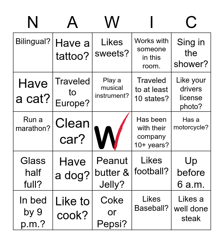 This bingo card has a free space and 24 words: Have a dog?, Like to cook?, Play a musical instrument?, In bed by 9 p.m.?, Sing in the shower?, Bilingual?, Have a cat?, Have a tattoo?, Has been with their company 10+ years?, Peanut butter & Jelly?, Traveled to at least 10 states?, Run a marathon?, Likes football?, Up before 6 a.m., Traveled to Europe?, Likes Baseball?, Has a motorcycle?, Likes sweets?, Like your drivers license photo?, Clean car?, Likes a well done steak, Glass half full?, Works with someone in this room. and Coke or Pepsi?.