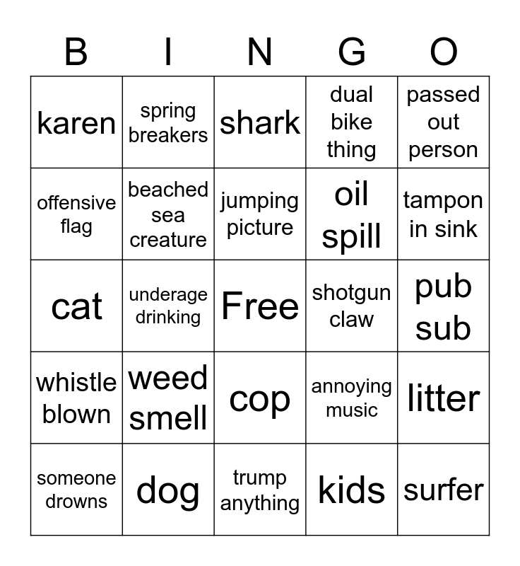 This bingo card has a free space and 24 words: weed smell, dog, jumping picture, someone drowns, passed out person, karen, offensive flag, spring breakers, shotgun claw, cop, oil spill, cat, annoying music, litter, beached sea creature, kids, pub sub, shark, tampon in sink, underage drinking, surfer, whistle blown, dual bike thing and trump anything.