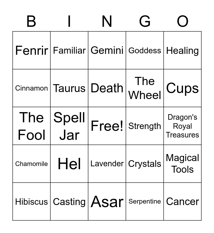 This bingo card has a free space and 139 words: Spring Equinox, Full Moon, New Moon, Abundance Spell, Candle Magic, Crystals, Dragon's Breath, Protection Spell, Herbs, Tea, Grimoire, Shadow Work, Deity Work, Incense, Divination, Tarot, Oracle, Dragon's Wings, Intention, Astrology, Birth Chart, Magical Tools, Books, Moon Phases, Healing Spell, Spell Jar, Familiar, Color Magic, Divine Power, Hocus Soap-Us, The Wandering Crow, Wolf Moon Apothecary TX, The Worlds of Ai, Dragon's Royal Treasures, Runes, Mythology, Paganism, Moon Water, Crystal Skull, Wands, Pentacles, Swords, Cups, Cleansing, Pendulum, Mortar & Pestle, The Tower, The World, The Star, The High Priestess, The Hermit, The Fool, Death, The Lovers, Adventurine, Selenite, Clear Quartz, Amethyst, Moldavite, Galexite, Serpentine, Tiger's Eye, Opal, Labradorite, Crystal Grid, Cernnunos, Loki, Brighid, Apollo, Hel, Fenrir, Emperor, Empress, Persephone, Nyx, Thor, Freyja, Goddess, God, Deity, Bastet, Aset, Asar, Horus, Chamomile, Mugwort, Lavender, Salt, Rose, Rosemary, Constellations, Casting, Protection Circle, Salt Lamp, Healing, Hex, Ceremonial Dagger, Banishing Spell, Dragon Scales, Zodiac Signs, Leo, Taurus, Aquarius, Pisces, Scorpio, Virgo, Capricorn, Aries, Libra, Cancer, Sagittarius, Gemini, The Magician, The Hierophant, The Chariot, Strength, The Wheel, Justice, The Hanged Man, Temperance, Judgement, The Sun, Desire, Oracle Deck, Athena, Artemis, Aphrodite, Diana, Lucifer, Angels, Demons, Witchcraft, Jasmine, Cinnamon, Hibiscus, Kitchen Witchery, Chaos Witch, Baneful Magic and Journals.