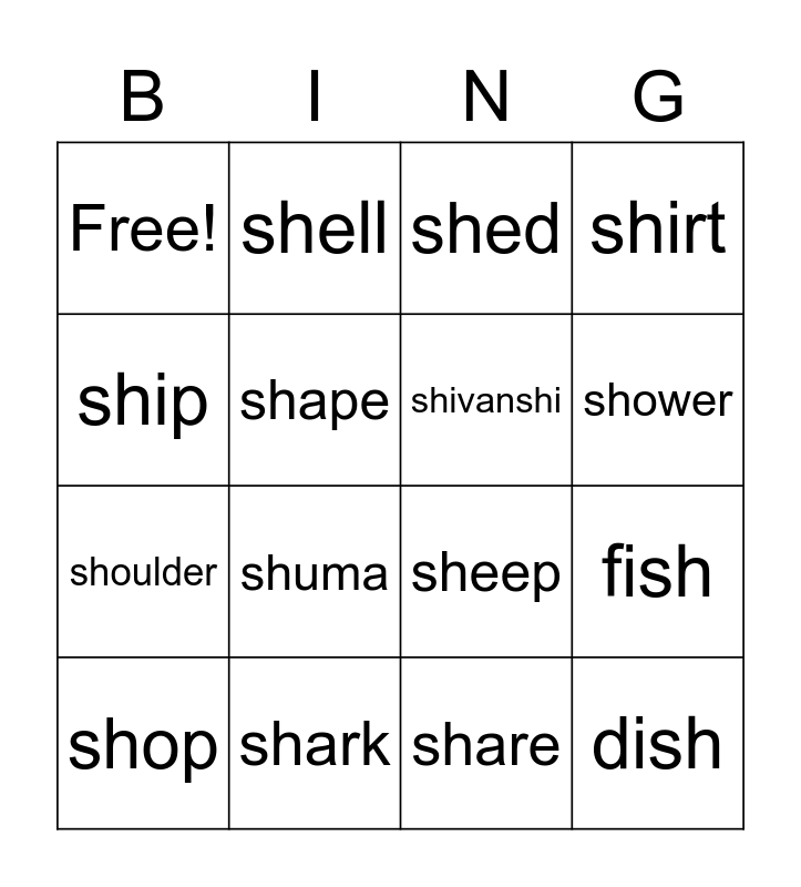 This bingo card has 16 words: shop, shark, shed, shirt, ship, shell, sheep, fish, Free!, shape, share, shower, shoulder, shuma, shivanshi and dish.