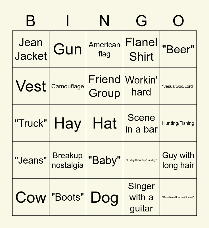 This bingo card has a free space and 33 words: Leather Jacket, Day drinking, "Baby", "Girl", "Jesus/God/Lord", Jean Jacket, Hay, Field, Flanel Shirt, "Country boy", Vest, Gun, "Mama/Mom", Singer with a guitar, "Beer", "Truck", Breakup nostalgia, Dog, "Friday/Saturday/Sunday", Hunting/Fishing, Cow, Horse, American flag, Scene in a bar, "Sunshine/Sunrise/Sunset", "Jeans", Camouflage, Friend Group, Workin' hard, Guy with long hair, Necklace with a cross, "Boots" and Life used to be good.