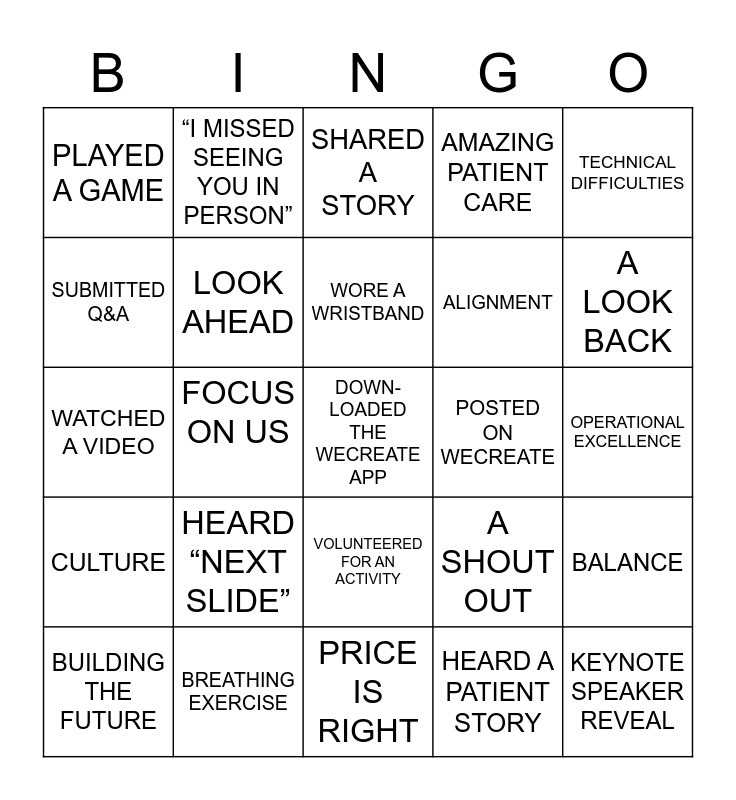 This bingo card has a free space and 24 words: HEARD “NEXT SLIDE”, BREATHING EXERCISE, WORE A WRISTBAND, BUILDING THE FUTURE, TECHNICAL DIFFICULTIES, PLAYED A GAME, SUBMITTED Q&A, “I MISSED SEEING YOU IN PERSON”, POSTED ON WECREATE, VOLUNTEERED FOR AN ACTIVITY, ALIGNMENT, WATCHED A VIDEO, A SHOUT OUT, BALANCE, LOOK AHEAD, HEARD A PATIENT STORY, OPERATIONAL EXCELLENCE, SHARED A STORY, A LOOK BACK, FOCUS ON US, KEYNOTE SPEAKER REVEAL, CULTURE, AMAZING PATIENT CARE and PRICE IS RIGHT.