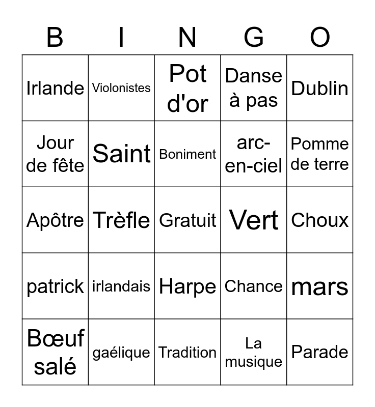 This bingo card has a free space and 24 words: irlandais, gaélique, Boniment, Bœuf salé, Dublin, Irlande, Jour de fête, Violonistes, Vert, Harpe, arc-en-ciel, Apôtre, Chance, mars, Saint, La musique, Choux, Pot d'or, Pomme de terre, Trèfle, Parade, patrick, Danse à pas and Tradition.