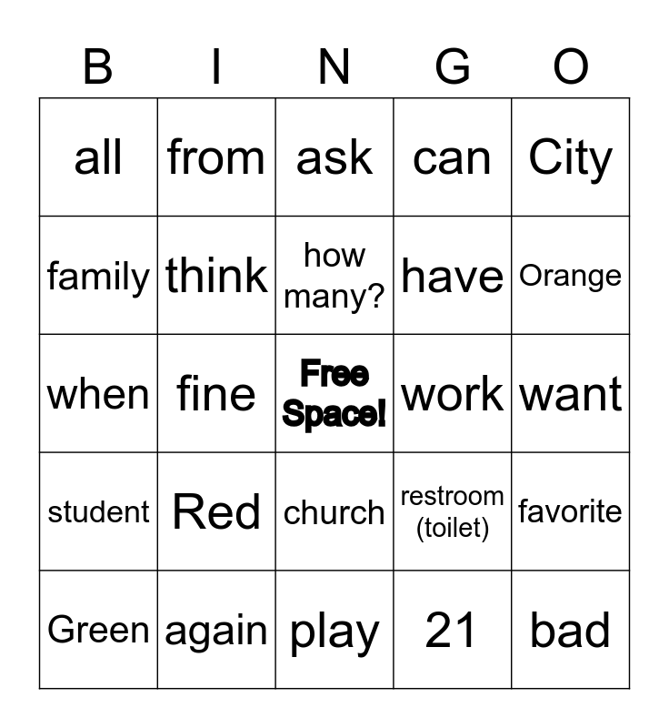 This bingo card has a free space and 24 words: Red, again, how many?, Green, City, all, family, from, work, church, have, when, restroom (toilet), favorite, think, 21, want, ask, Orange, fine, bad, student, can and play.