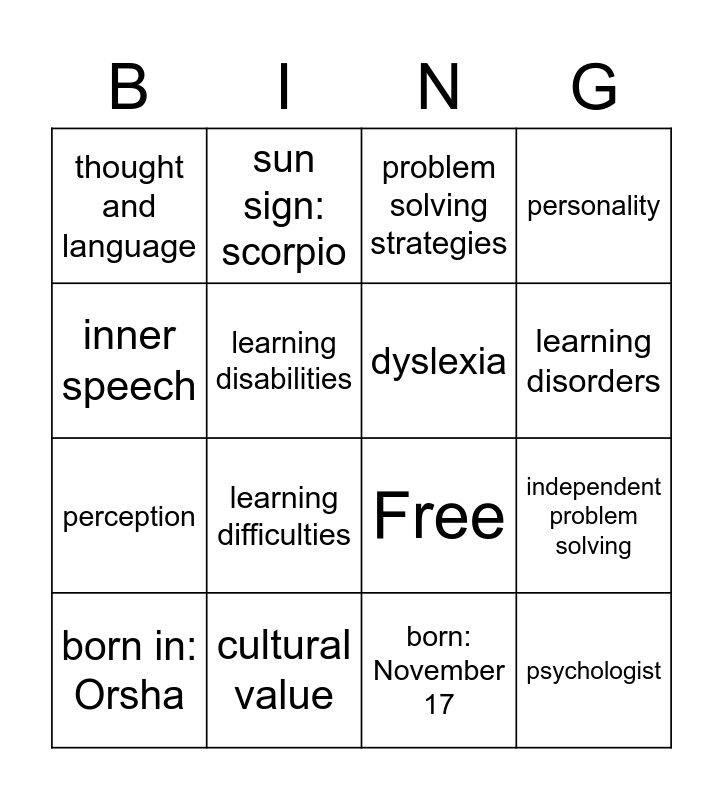This bingo card has 16 words: cultural value, independent problem solving, problem solving strategies, thought and language, perception, sun sign: scorpio, Free, born: November 17, inner speech, learning disabilities, born in: Orsha, personality, learning difficulties, learning disorders, dyslexia and psychologist.