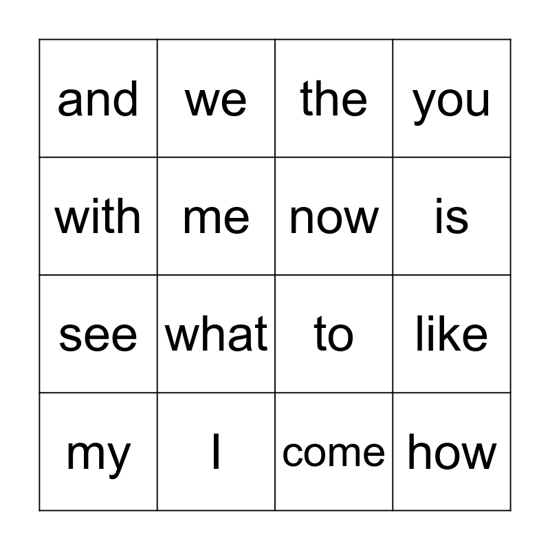 This bingo card has 16 words: I, like, the, and, see, we, to, come, with, me, my, you, what, is, now and how.