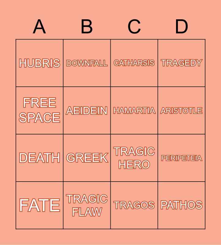 This bingo card has 16 words: TRAGIC FLAW, PERIPETEIA, CATHARSIS, HUBRIS, DEATH, DOWNFALL, TRAGIC HERO, TRAGOS, FREE SPACE, AEIDEIN, FATE, TRAGEDY, GREEK, ARISTOTLE, HAMARTIA and PATHOS.