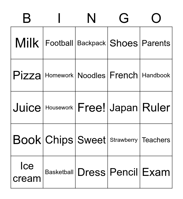 This bingo card has a free space and 24 words: Chips, Basketball, Noodles, Ice cream, Parents, Milk, Pizza, Football, Japan, Sweet, French, Juice, Strawberry, Teachers, Homework, Pencil, Ruler, Backpack, Handbook, Housework, Exam, Book, Shoes and Dress.