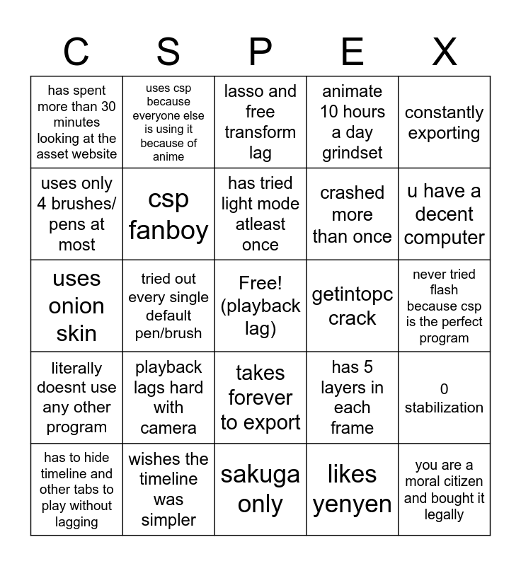 This bingo card has a free space and 24 words: playback lags hard with camera, wishes the timeline was simpler, has tried light mode atleast once, has to hide timeline and other tabs to play without lagging, constantly exporting, has spent more than 30 minutes looking at the asset website, uses only 4 brushes/ pens at most, uses csp because everyone else is using it because of anime, getintopc crack, takes forever to export, crashed more than once, uses onion skin, has 5 layers in each frame, 0 stabilization, csp fanboy, likes yenyen, never tried flash because csp is the perfect program, lasso and free transform lag, u have a decent computer, tried out every single default pen/brush, you are a moral citizen and bought it legally, literally doesnt use any other program, animate 10 hours a day grindset and sakuga only.