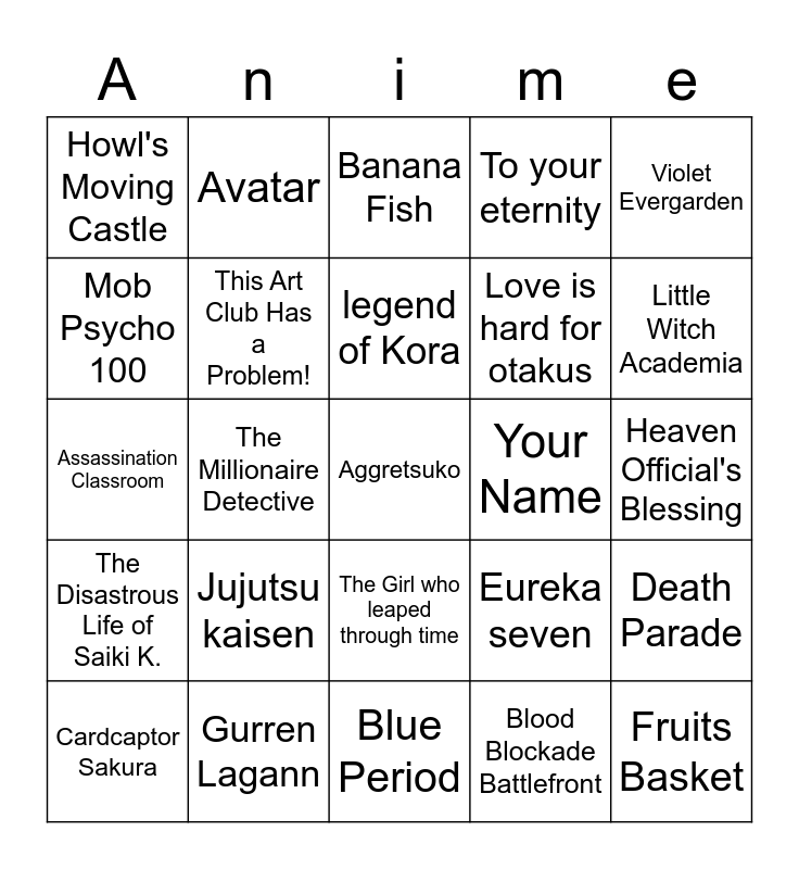 This bingo card has 25 words: The Disastrous Life of Saiki K., Gurren Lagann, Aggretsuko, Blood Blockade Battlefront, Violet Evergarden, Howl's Moving Castle, Avatar, Banana Fish, Your Name, Death Parade, Mob Psycho 100, This Art Club Has a Problem!, Blue Period, Eureka seven, Little Witch Academia, Cardcaptor Sakura, The Millionaire Detective, legend of Kora, Love is hard for otakus, Heaven Official's Blessing, Assassination Classroom, Jujutsu kaisen, The Girl who leaped through time, To your eternity and Fruits Basket.
