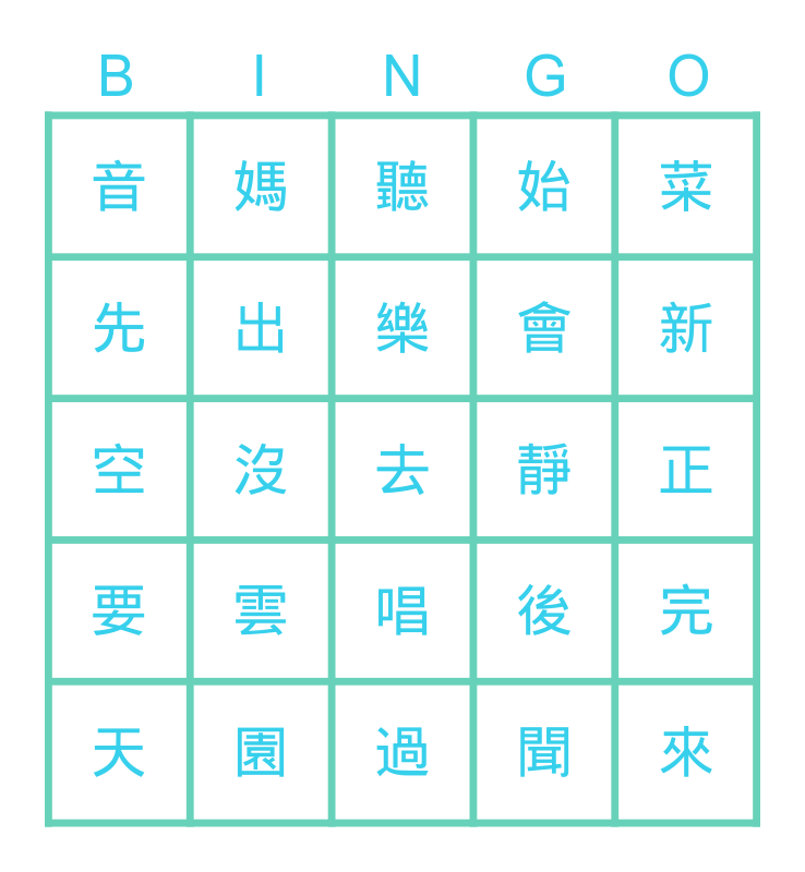 This bingo card has 25 words: 要, 園, 去, 聞, 菜, 音, 媽, 聽, 靜, 完, 先, 出, 過, 後, 新, 天, 沒, 樂, 會, 正, 空, 雲, 唱, 始 and 來.