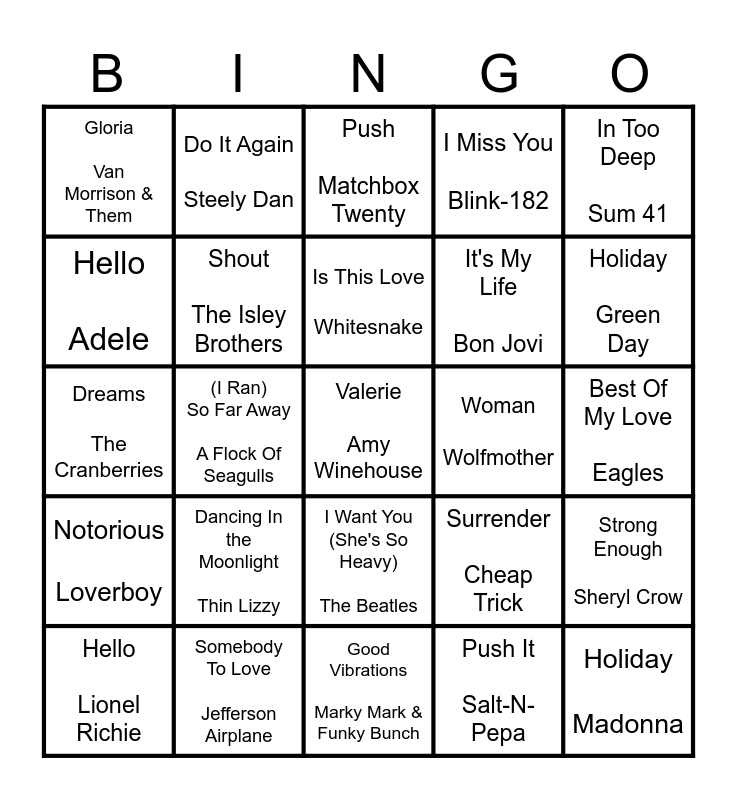 This bingo card has 98 words: Around The World Red Hot Chili Peppers, Around The World Daft Punk, Best Of My Love The Emotions, Best Of My Love Eagles, Changes Black Sabbath, Changes David Bowie, Cherry Bomb John Mellencamp, Cherry Bomb The Runaways, Crazy Gnarls Barkley, Crazy Aerosmith, Creep Radiohead, Creep TLC, Dancing In The Moonlight King Harvest, Dancing In the Moonlight Thin Lizzy, Do It Again Queens Of The Stone Age, Do It Again Steely Dan, Dreams The Cranberries, Dreams Fleetwood Mac, Drive The Cars, Drive Incubus, Fever Peggy Lee, Fever The Black Keys, Forever Young Bob Dylan, Forever Young Rod Stewart, Gloria Laura Branigan, Gloria Van Morrison & Them, Good Vibrations Marky Mark & Funky Bunch, Good Vibrations The Beach Boys, Heartbreaker Pat Benatar, Heartbreaker Led Zeppelin, Hello Lionel Richie, Hello Adele, Hold On Wilson Phillips, Hold On Alabama Shakes, Holiday Green Day, Holiday Madonna, I Miss You Blink-182, I Miss You The Rolling Stones, (I Ran) So Far Away A Flock Of Seagulls, So Far Away Dire Straits, Is This Love Bob Marley, Is This Love Whitesnake, It's My Life Bon Jovi, It's My Life Talk Talk, I Want You Savage Garden, I Want You (She's So Heavy) The Beatles, I Wish Stevie Wonder, I Wish Skee-Lo, Jump Van Halen, Jump The Pointer Sisters, Learning To Fly Pink Floyd, Learning To Fly Tom Petty, Maneater Hall & Oates, Maneater Nelly Furtado, Maria Blondie, Maria Maria Santana, Notorious Loverboy, Notorious Duran Duran, Numb Linkin Park, Numb Holly McNarland, One U2, One Metallica, Ophelia The Band, Ophelia The Lumineers, Our House Madness, Our House Crosby, Stills & Nash, Photograph Def Leppard, Photograph Nickelback, The Power Of Love Céline Dion, The Power Of Love Huey Lewis & The News, Push Matchbox Twenty, Push Moist, Push It Salt-N-Pepa, Push It Garbage, Runaway Janet Jackson, Runaway Del Shannon, Saturday Night Bay City Rollers, Saturday Night Yukon Blonde, Valerie Steve Winwood, Valerie Amy Winehouse, Shout Tears For Fears, Shout The Isley Brothers, Somebody To Love Jefferson Airplane, Somebody To Love Queen, Someday Sugar Ray, Someday The Strokes, SOS ABBA, SOS (Sawed Off Shotgun) The Glorious Sons, Strong Enough Sheryl Crow, Strong Enough Cher, Surrender Elvis Presley, Surrender Cheap Trick, Wake Up Arcade Fire, Wake Up Rage Against the Machine, Woman Wolfmother, Woman John Lennon, In Too Deep Sum 41 and In Too Deep Genesis.