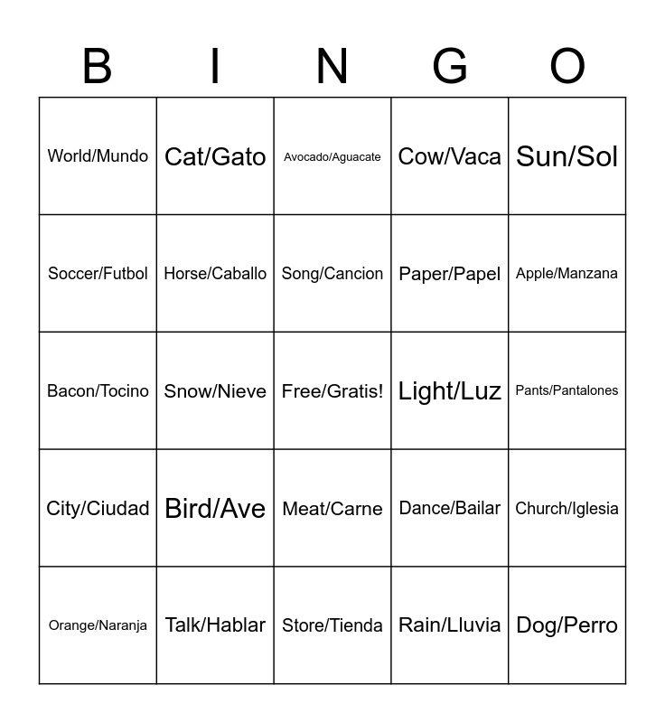 This bingo card has a free space and 49 words: Food/Comida, Dog/Perro, Book/Libro, Store/Tienda, Bird/Ave, Water/Agua, Cat/Gato, House/Casa, Soccer/Futbol, Work/Trabajo, Horse/Caballo, Cow/Vaca, Church/Iglesia, Dance/Bailar, Eat/Comer, Sing/Cantar, Song/Cancion, Light/Luz, Star/Estrella, Sun/Sol, Snow/Nieve, Rain/Lluvia, World/Mundo, Paper/Papel, Tree/Arbol, Apple/Manzana, Orange/Naranja, Shark/Tiburon, Meat/Carne, City/Ciudad, Write/Escribir, Read/Leer, Party/Fiesta, Meatball/Abondiga, Talk/Hablar, Lake/Lago, River/Rio, Shirt/Camisa, Pants/Pantalones, Shoe/Zapato, Bear/Oso, Sheep/Oveja, Goat/Cabra, Egg/Huevo, Bacon/Tocino, Avocado/Aguacate, Lettuce/Lechuga, Onion/Cebolla and Carrot/Zanahoria.
