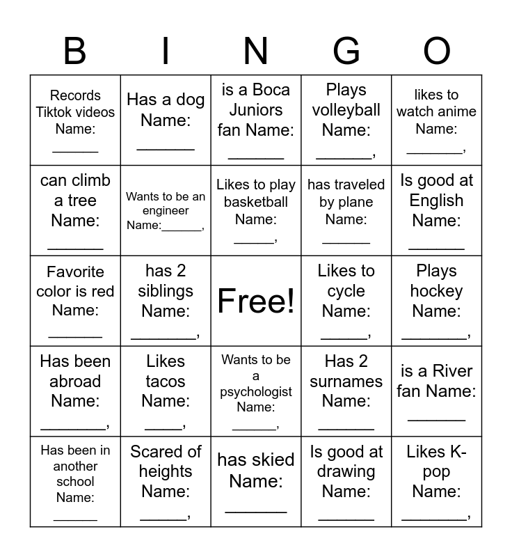 This bingo card has a free space and 41 words: Has an allergy Name: ______, Favorite color is red Name: ______, has 1 brother Name:______,, Wants to be an engineer Name:______,, Scared of heights Name: _____,, Wants to be a psychologist Name: ______,, Likes to play basketball Name: _____,, enjoys the smell of gasoline Name: _______,, likes to watch anime Name: _______,, Has been abroad Name: _______,, has 2 siblings Name: _______,, Plays volleyball Name: ______,, Likes K-pop Name: _______,, Plays hockey Name: _______,, Likes to cycle Name: _____,, Likes tacos Name: ____,, Was born in Capital federal Name: ______, Records Tiktok videos Name: ______, Wants to be a doctor Name: ______, is a Boca Juniors fan Name: ______, is a River fan Name: ______, Has been in Mar del plata Name: ______, has skied Name: ______, has traveled by plane Name: ______, has travelled by subway Name: ______, has a Playstation Name: ______, Is good at drawing Name: ______, is good at maths Name: ______, Is good at English Name: ______, Is an only child Name: ______, Has a cat Name: ______, Has a dog Name: ______, Has been in another school Name: ______, Lives near school Name: ______, Has 2 surnames Name: ______, can climb a tree Name: ______, plays an instrument Name: ______, enjoys singing Name: ______, can dance Name: ______, same birth month as you Name: ______ and same name initial Name: ______.
