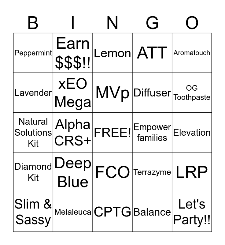 This bingo card has a free space and 24 words: Deep Blue, Melaleuca, MVp, Slim & Sassy, Aromatouch, Peppermint, Lavender, Earn $$$!!, Empower families, FCO, Diffuser, Natural Solutions Kit, Terrazyme, LRP, xEO Mega, Balance, Elevation, Lemon, OG Toothpaste, Alpha CRS+, Let's Party!!, Diamond Kit, ATT and CPTG.