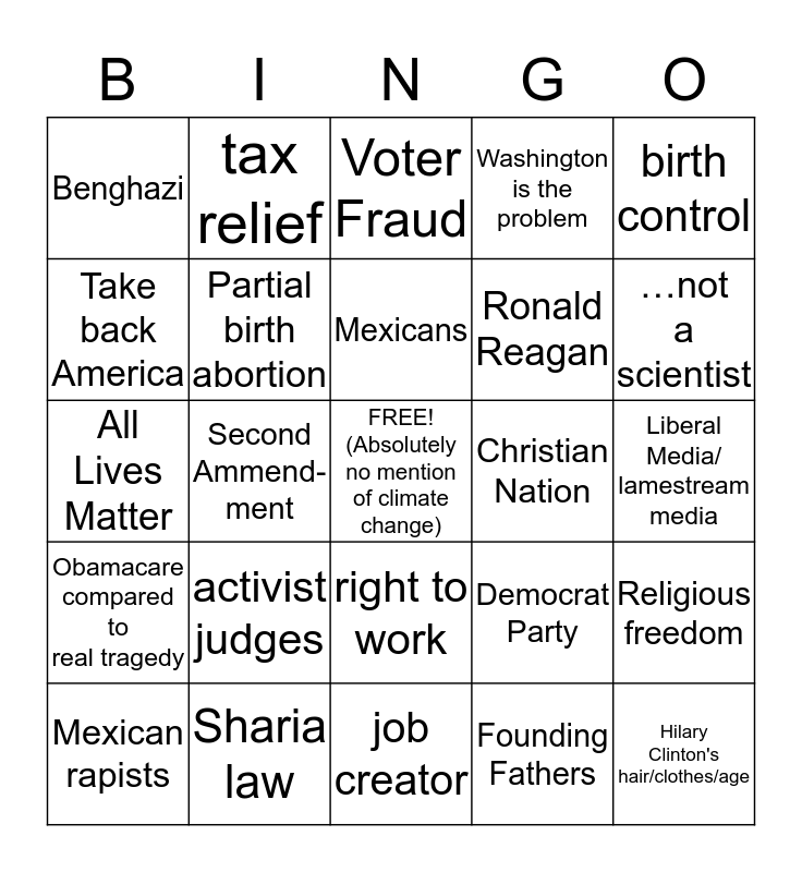 This bingo card has a free space and 24 words: activist judges, Sharia law, Mexicans, Mexican rapists, birth control, Benghazi, Take back America, tax relief, Christian Nation, right to work, Ronald Reagan, All Lives Matter, Democrat Party, Religious freedom, Partial birth abortion, Founding Fathers, Liberal Media/ lamestream media, Voter Fraud, …not a scientist, Second Ammend-ment, Hilary Clinton's hair/clothes/age, Obamacare compared to real tragedy, Washington is the problem and job creator.