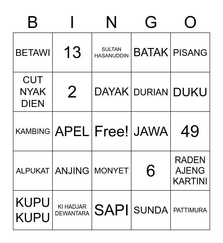 This bingo card has a free space and 24 words: ANJING, KI HADJAR DEWANTARA, DAYAK, KUPU KUPU, PISANG, BETAWI, CUT NYAK DIEN, 13, JAWA, MONYET, DURIAN, KAMBING, 6, RADEN AJENG KARTINI, 2, SUNDA, 49, SULTAN HASANUDDIN, DUKU, APEL, PATTIMURA, ALPUKAT, BATAK and SAPI.