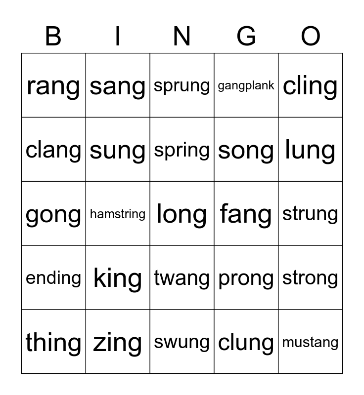 This bingo card has a free space and 24 words: king, zing, spring, thing, cling, rang, clang, sang, fang, twang, song, gong, prong, strong, sung, clung, strung, sprung, lung, hamstring, mustang, ending, gangplank and swung.