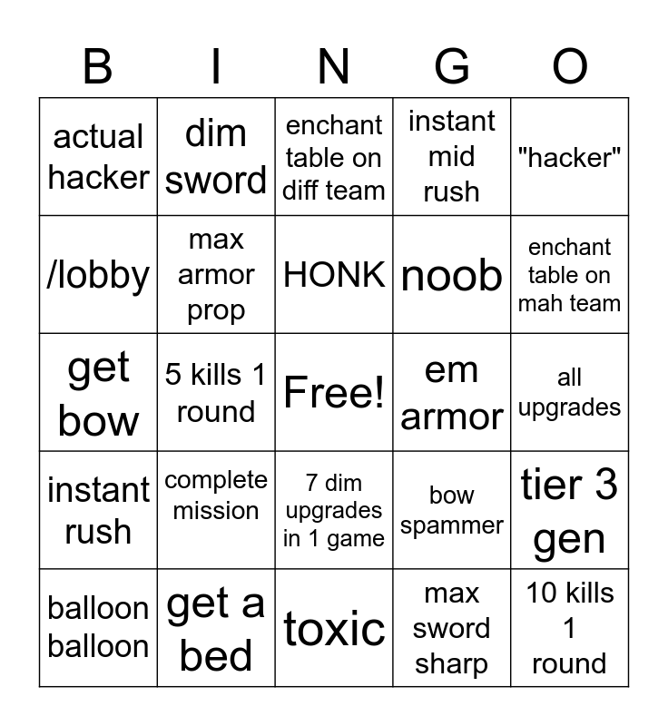 This bingo card has a free space and 24 words: complete mission, get a bed, HONK, balloon balloon, "hacker", actual hacker, /lobby, dim sword, em armor, 7 dim upgrades in 1 game, noob, get bow, bow spammer, tier 3 gen, max armor prop, max sword sharp, all upgrades, enchant table on diff team, enchant table on mah team, 5 kills 1 round, 10 kills 1 round, instant rush, instant mid rush and toxic.