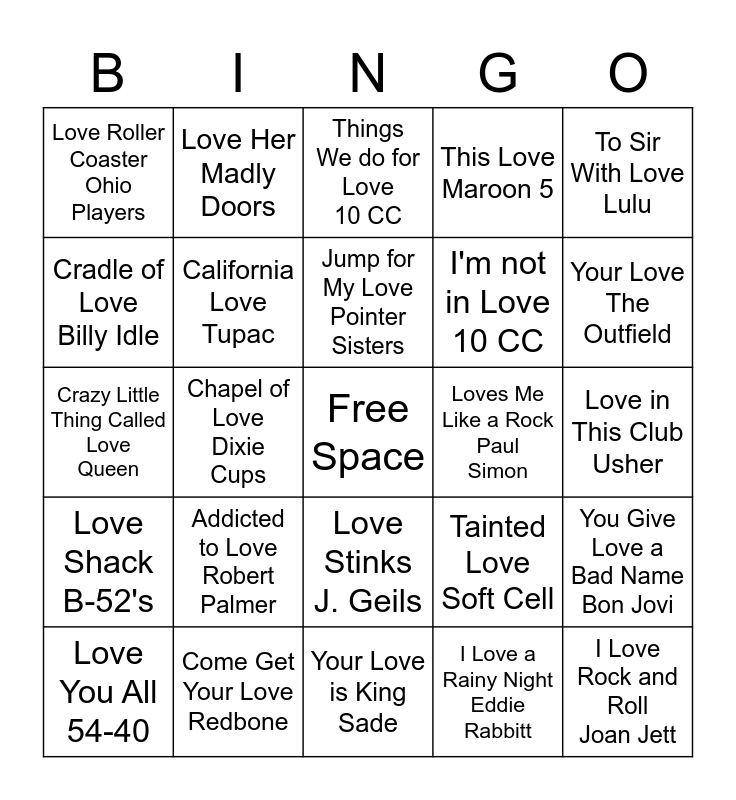 This bingo card has a free space and 24 words: Addicted to Love Robert Palmer, Come Get Your Love Redbone, Jump for My Love Pointer Sisters, Love You All 54-40, To Sir With Love Lulu, Love Roller Coaster Ohio Players, Cradle of Love Billy Idle, Love Her Madly Doors, Loves Me Like a Rock Paul Simon, Love Stinks J. Geils, I'm not in Love 10 CC, Crazy Little Thing Called Love Queen, Tainted Love Soft Cell, You Give Love a Bad Name Bon Jovi, California Love Tupac, I Love a Rainy Night Eddie Rabbitt, Love in This Club Usher, Things We do for Love 10 CC, Your Love The Outfield, Chapel of Love Dixie Cups, I Love Rock and Roll Joan Jett, Love Shack B-52's, This Love Maroon 5 and Your Love is King Sade.