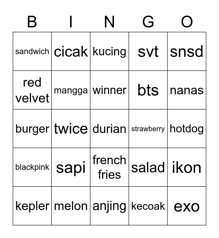 This bingo card has a free space and 24 words: sapi, melon, winner, kepler, snsd, sandwich, red velvet, cicak, strawberry, french fries, bts, burger, salad, ikon, mangga, kecoak, hotdog, kucing, nanas, twice, exo, blackpink, svt and anjing.