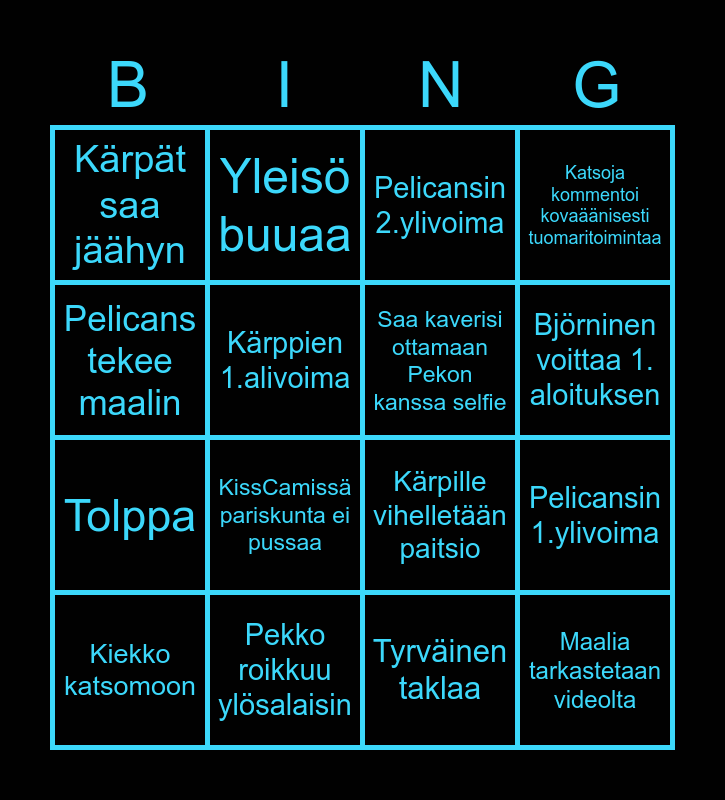 This bingo card has 16 words: Pekko roikkuu ylösalaisin, Pelicansin 1.ylivoima, Pelicansin 2.ylivoima, Kärpät saa jäähyn, Tolppa, Yleisö buuaa, Kärpille vihelletään paitsio, Tyrväinen taklaa, Pelicans tekee maalin, Kärppien 1.alivoima, Kiekko katsomoon, Katsoja kommentoi kovaäänisesti tuomaritoimintaa, KissCamissä pariskunta ei pussaa, Björninen voittaa 1. aloituksen, Saa kaverisi ottamaan Pekon kanssa selfie and Maalia tarkastetaan videolta.