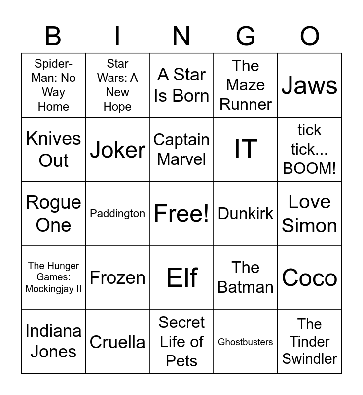 This bingo card has a free space and 25 words: Frozen, Secret Life of Pets, Captain Marvel, Indiana Jones, Jaws, Spider-Man: No Way Home, Knives Out, Star Wars: A New Hope, Dunkirk, Elf, IT, Rogue One, The Batman, Coco, Joker, Skyfall, Love Simon, A Star Is Born, tick tick... BOOM!, Paddington, The Tinder Swindler, Cruella, The Hunger Games: Mockingjay II, The Maze Runner and Ghostbusters.