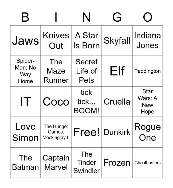 This bingo card has 26 words: Free!, Frozen, Secret Life of Pets, Captain Marvel, Indiana Jones, Jaws, Spider-Man: No Way Home, Knives Out, Star Wars: A New Hope, Dunkirk, Elf, IT, Rogue One, The Batman, Coco, Joker, Skyfall, Love Simon, A Star Is Born, tick tick... BOOM!, Paddington, The Tinder Swindler, Cruella, The Hunger Games: Mockingjay II, The Maze Runner and Ghostbusters.