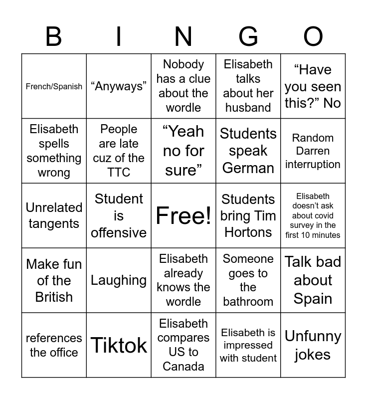 This bingo card has a free space and 24 words: Laughing, Tiktok, “Yeah no for sure”, references the office, “Have you seen this?” No, French/Spanish, Elisabeth spells something wrong, “Anyways”, Students bring Tim Hortons, Elisabeth already knows the wordle, Students speak German, Unrelated tangents, Someone goes to the bathroom, Talk bad about Spain, People are late cuz of the TTC, Elisabeth is impressed with student, Elisabeth doesn’t ask about covid survey in the first 10 minutes, Nobody has a clue about the wordle, Random Darren interruption, Student is offensive, Unfunny jokes, Make fun of the British, Elisabeth talks about her husband and Elisabeth compares US to Canada.