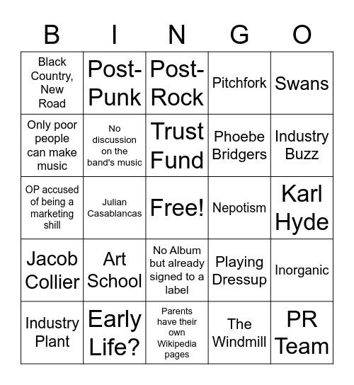 This bingo card has a free space and 24 words: Industry Plant, Art School, Trust Fund, The Windmill, Swans, Black Country, New Road, Post-Punk, Post-Rock, Nepotism, Karl Hyde, OP accused of being a marketing shill, No discussion on the band's music, Playing Dressup, Inorganic, Only poor people can make music, Early Life?, Parents have their own Wikipedia pages, Pitchfork, Industry Buzz, Jacob Collier, Julian Casablancas, No Album but already signed to a label, Phoebe Bridgers and PR Team.