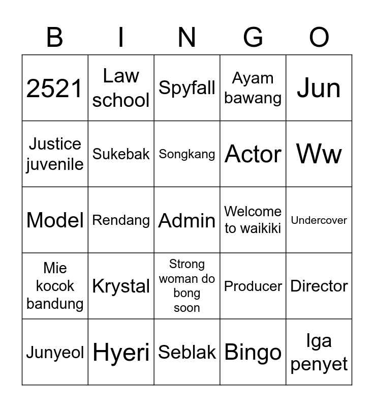 This bingo card has a free space and 24 words: Krystal, Hyeri, Songkang, Junyeol, Jun, 2521, Justice juvenile, Law school, Welcome to waikiki, Strong woman do bong soon, Actor, Model, Producer, Director, Sukebak, Bingo, Undercover, Spyfall, Ww, Rendang, Iga penyet, Mie kocok bandung, Ayam bawang and Seblak.